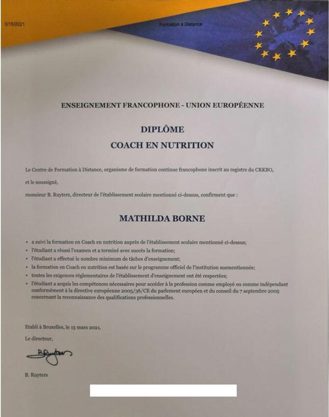 Diplôme de "Coach en nutrition" délivré par le Centre de Formation à Distance, organisme de formation continue inscrit au registre du CRKBO