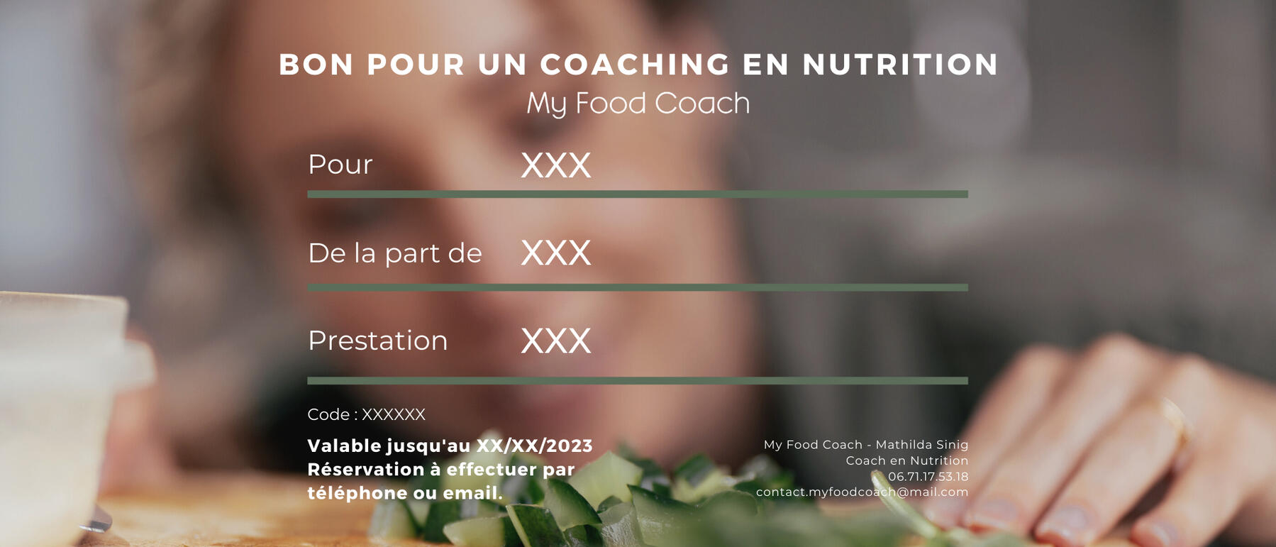 Offrir une prestation My Food Coach c'est offrir des clés vers la découverte d'une alimentation pleinement satisfaisante à ceux que tu aimes 🗝️.Les consultations et les suivis individuels sont des expériences riches d'enseignements et créées pour faire avancer chacun vers un mieux être 😌.N'est-ce pas un beau cadeau, une belle preuve d'amour que d'offrir les moyens de se sentir mieux au quotidien 💕 ?Choisisse ton cadeau et suis le lien pour acheter le bon correspondant au tarif indiqué 👇